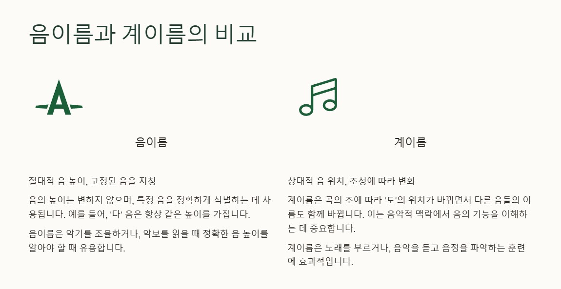 요약하면, 음이름은 음의 고유한 높이를 나타내며, 계이름은 곡의 조성에 따라 음의 관계를 나타냅니다. 이러한 차이를 이해하면 악보를 읽거나 음악을 연주할 때 큰 도움이 됩니다.