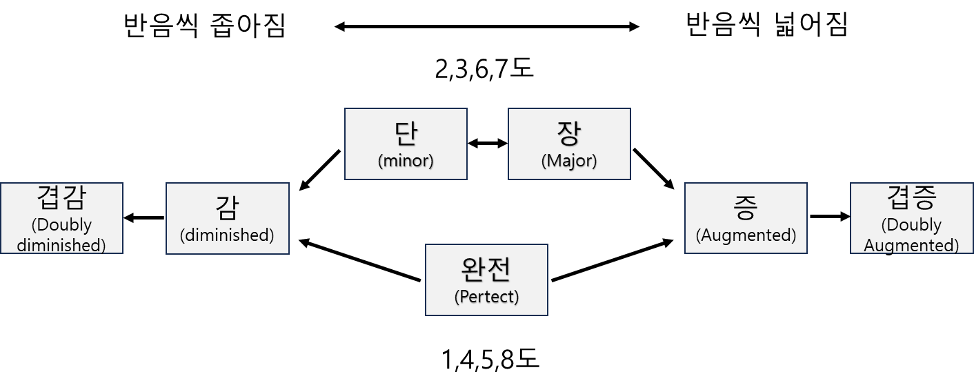 장음정(Major)과 단음정(Minor): 2도, 3도, 6도, 7도는 '장'(메이저)과 '단'(마이너)으로 구분됩니다. 예를 들어, 장3도, 단3도 등.
